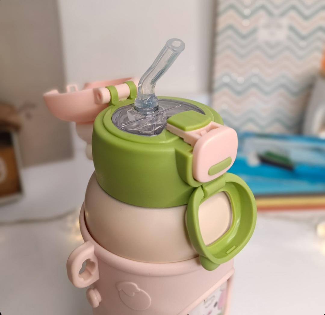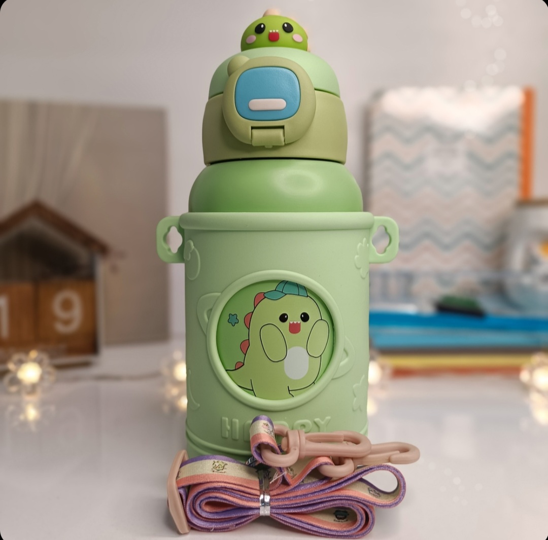 قمقمه عروسکی کاوردار با بند بلند قابل تنظیم،جنس استیل،جنس کاور سیلیکونی،درب قفل دار