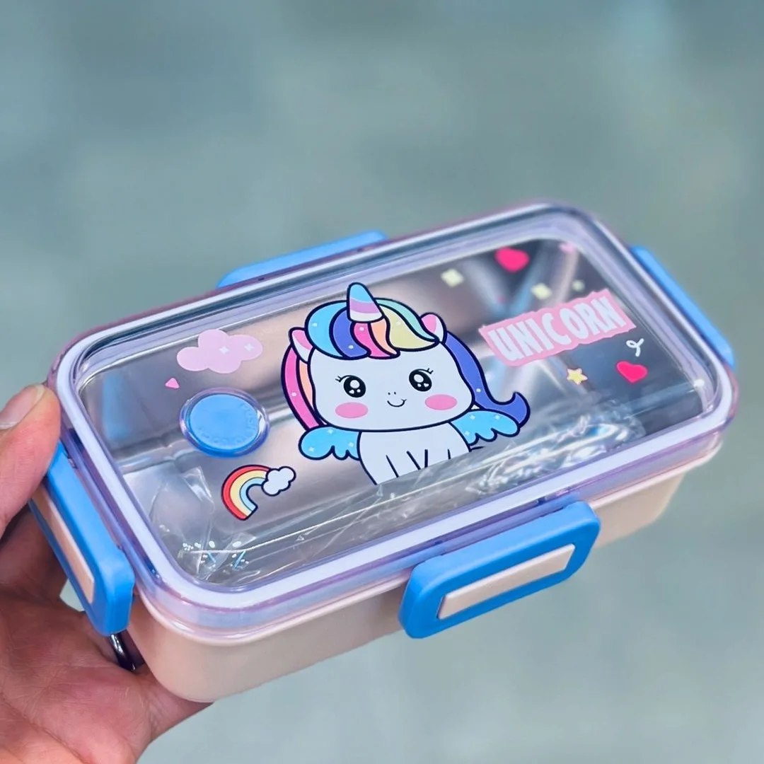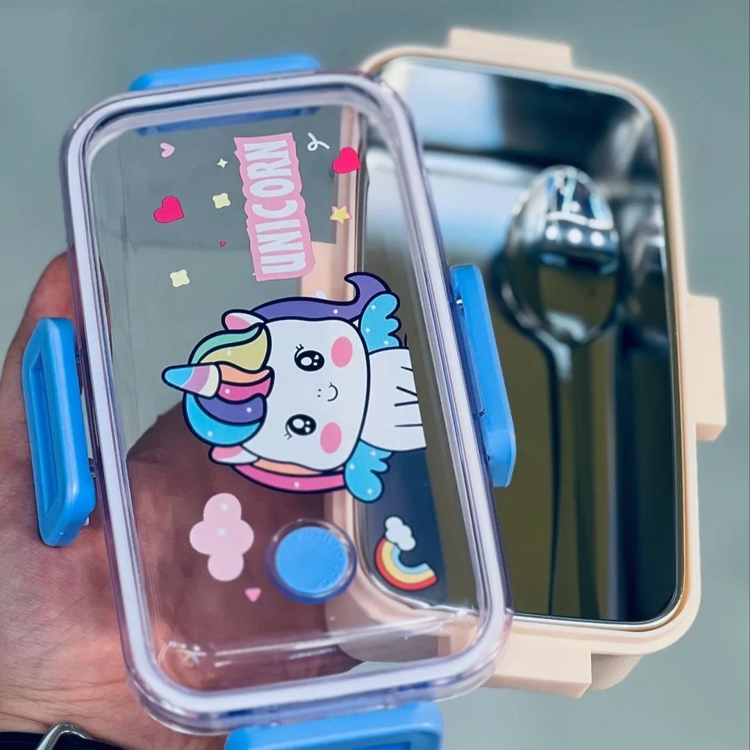 ظرف غذای استیل کوچک، طرح یونیکورن،دارای heatable water، با این قابلیت در قسمت زیرین ظرف استیل میتوان آب داغ ریخته و غذا را گرم گه داشت،دارای یک قاشق استیل،واشر دار بدون هیچگونه نشتی
