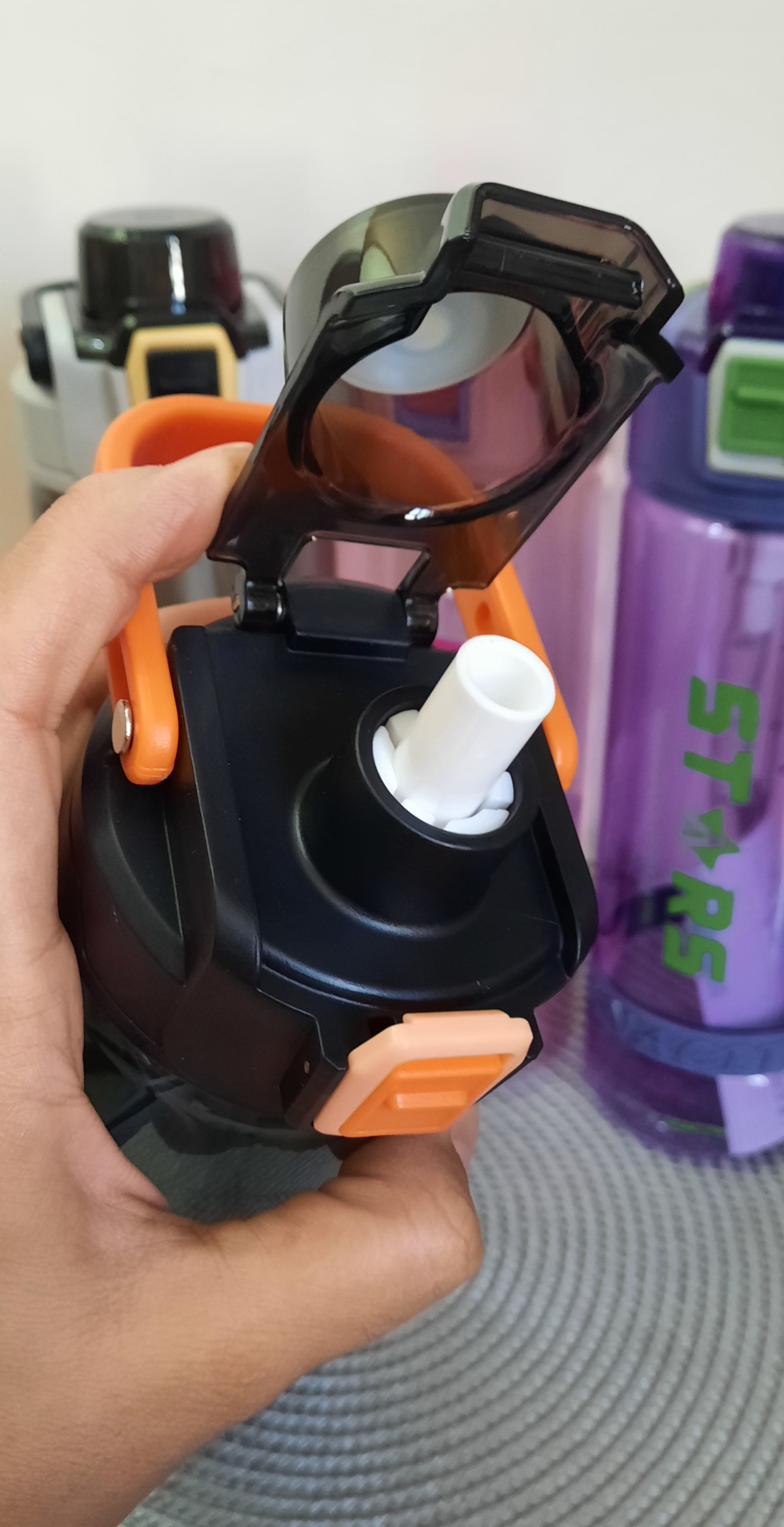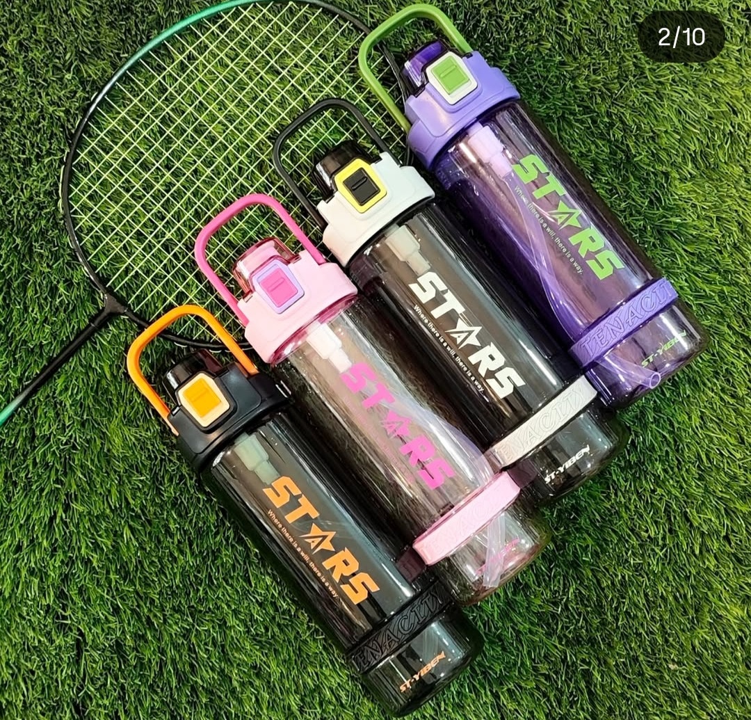 🔸️قمقمه st-yiben مدل stars،🔹️بدنه شفاف و رنگی از پلاستیک با کیفیت🔸️درب قفلی🔹️نی دار🔸️واشر سیلیکونی رو درب🔹️دارای دستگیره متحرک تا شونده 🔸️دارای نی سیلیکونی با قطر ۱۰ میل🔹️دارای نمایشگر حجم روی بدنه🔸️بدون کوچکترین نشتی🔹️مناسب همه رده های سنی،مدرسه ،دانشگاه،باشگاه، کمپ و سفر